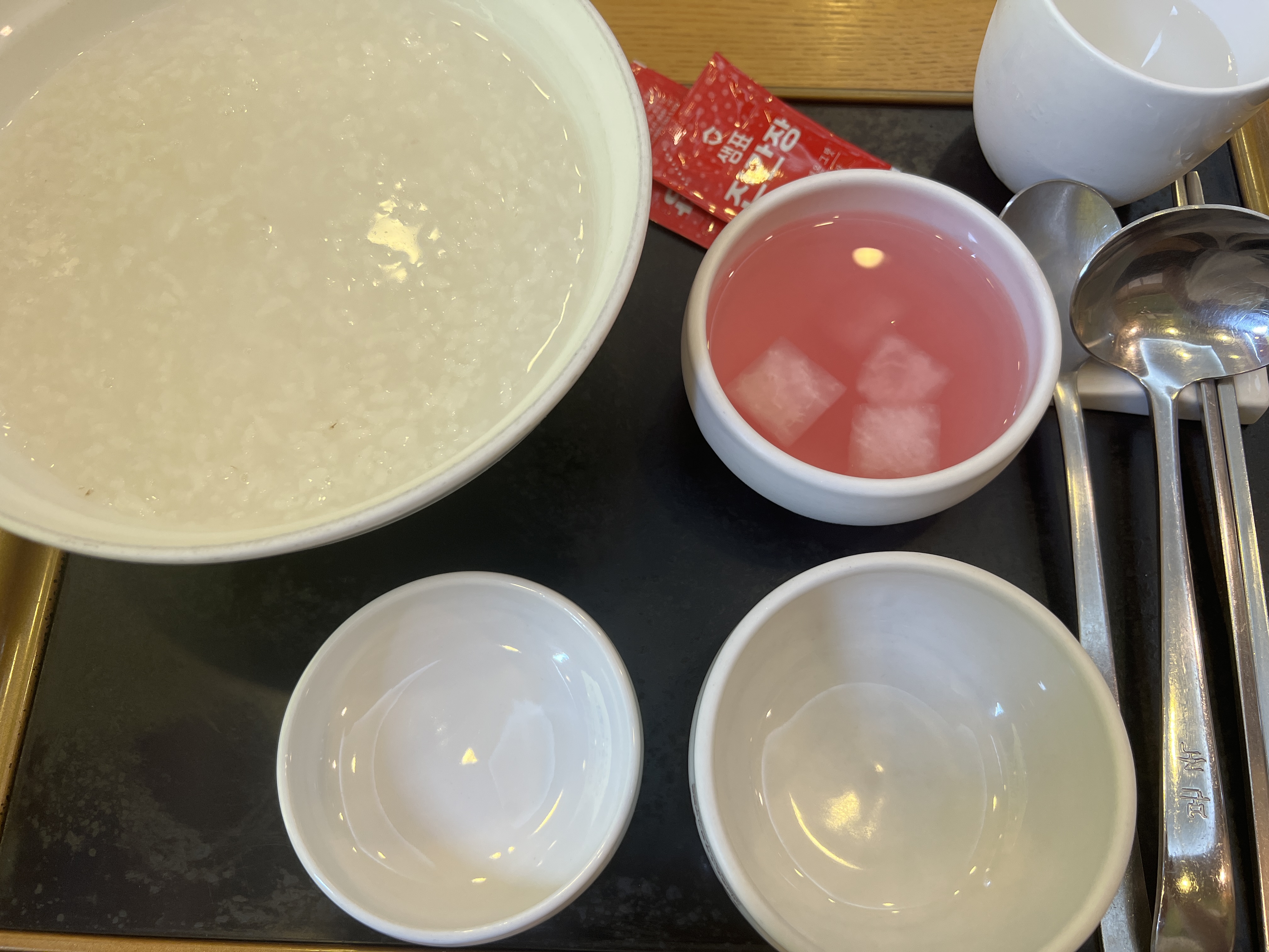 본죽에서 흰죽을 시키면 이렇게 멀건 흰죽과 간장 동치미를 줍니다